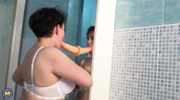 Бабушка решила совместить приятное с полезным и начала принимать душ и заодно баловать себя пальчиками. Сучка полапала себя за прелести и принялась мастурбировать влагалище. Когда предварительных ласк старухе не хватило, она качественно смочила резиновый член слюнями, а уже потом оттрахала себя до бурного оргазма.