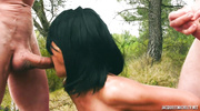 Брюнетка с маленькой грудью выбралась на свежий воздух и там нарвалась на жаркий тройничок с двумя извращенцами. Мадам с длинными ножками сняла лишнюю одежду и сразу начала демонстрировать прелести и умения. Качественно облизав член, ненасытная потаскушка выпросила глубокое проникновение во влагалище и кончила несколько раз подряд.
