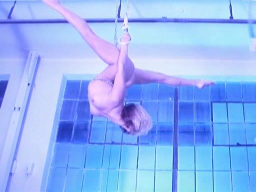 Эротический перформанс акробатки-фитоняшки начался в воздухе. Голая девушка с голыми сиськами позировала, извиваясь и демонстрируя свое шикарное тело и худую фигуру. Она напрягала мышцы, показывая камере свою киску крупным планом. Ее тело покрылось потом от напряжения. В финале она спустилась на пол и принялась мастурбировать себя рукой, готовясь к оргазму.