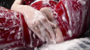 Развратная блондинка с большими сиськами заприметила большой дилдо, торчащий из дырки в стене. Милфа не захотела упускать возможность и решила воспользоваться им, лишь бы заработать бурный оргазм. Дамочка облизала игрушку по всем правилам, а уже потом дала трахнуть себя в разных позах и получила море искусственной спермы на лицо и дойки.
