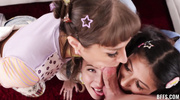 Три милые подружки с большими задницами устроили лесбийский секс и стали дразнить знакомого. Цыпочки насладились шаловливыми пальчиками и язычками друг друга, а потом начали сосать стоячий член. После оральных ласк крошки с шикарными формами отдались в мокрые пилотки и громко стонали, пока не достигли яркого финала.