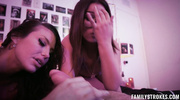 Скромная малышка попадает в плен страсти между опытной мачехой и её ненасытным мужчиной. Их жадные губы и горячие языки сливаются в тройном марафоне оральных ласк, а потом обе красотки с восторгом принимают глубокое проникновение, теряя контроль в волне оргазмов. Погрузись в этот откровенный тройничок — тебя ждёт взрыв похоти и желание большего!
