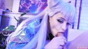 Беленькая штучка в латексе и черных чулочках дразнила парня, пока не заставила его член подняться. Тогда косплейщица без трусиков встала на колени и качественно обслюнявила член. Закончив работать ротиком, миленькая развратница в татуировках отдалась в розовую киску, а потом кончила еще и от анала.