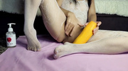Жесткий садовый инструмент нашелся для мамаши в колготках, которая засунула огромный кабачок в вагину. Милфа сразу завалилась на пол, подставляя тугую киску под овощ, чтобы все было крупным планом. Она облизала толстый кабачок, готовя его к проникновению. Мамка ввела овощ в горячую вагину с мощным напором, сжимая мышцы. Стоны стали громче, когда она продолжила активно долбить себя овощем, пока тело не зашлось в конвульсиях оргазма.