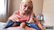 Улыбчивая блондиночка в татуировках возбудила парня с утра пораньше и устроила страстный секс. Малышка в коротких шортиках завалила чувака на лопатки и начала сосать ему, не обращая внимание на включенную камеру. После слюнявого отсоса беленькая девчушка прокатилась на члене верхом, а потом дала отыметь себя и в других позах.