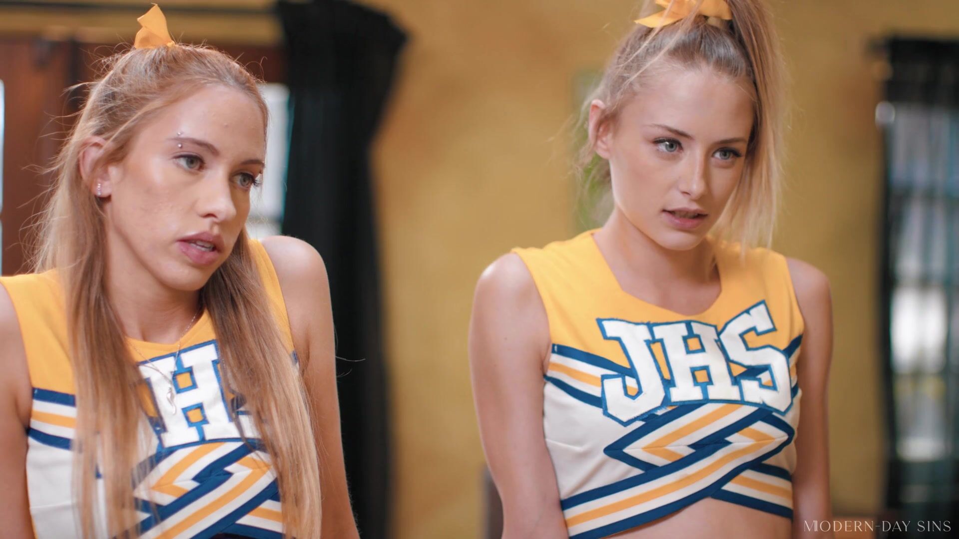 Две нежные крошки в откровенных нарядах закончили с упражнениями и напросились на страстный секс втроем с тренером. Чирлидерши раздвинули ножки и дали вылизать сладкие киски до блеска. Когда миленькие штучки получили удовольствие от кунилингуса, они качественно отсосали мужику, а уже потом кончили от траха во влажные пилотки.