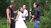 Жених подложил невесту под толпу на природе. Пылкая шлюшка смочила их члены слюнями, заглатывая по гланды, и подставила мокрую пилотку. Они таранили её, пуская по кругу, пока стоны не заглушили лес. Двойное проникновение довело её до визга, а соки текли по траве. Сперма залила её тело, стекая по коже. Её фата сползла, а платье порвалось. Кусты шуршали, а её сиськи дрожали. Сексапильная дива упивалась диким экстазом.