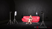 Девушка занимается сексом с фотографом на красном диване в фотостудии.