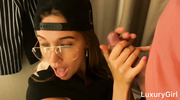 Очкастая телочка потащила парня на шоппинг, а там заодно решила пошалить с ним. Сексапильная россиянка легко возбудила парня дальше некуда и сразу же начала сосать член. Продолжая работать ртом и ручками прямо в примерочной, девчонка довела чувака до пика наслаждения, а сама в завершении угостилась вкусной спермой.