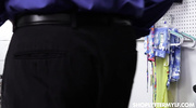 Охранник с коллегой притащили воровку в подсобку, где планировали допросить ее и сдать ментам. Чтобы не оказаться за решеткой, брюнеточка встала на колени и отсосала мужику, как настоящая шлюшка. После этого и беленькая охранница также умело отсосала член, а уже потом они по очереди отдались в вагины и заполучили бурный оргазм.