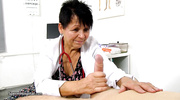 Старая докторша заставила парня дрочить на осмотре. Она мастурбировала его анус пальцем, затем полировала ствол руками. Он стонал, пока она теребила его яйца. Сперма брызнула на её дойки. Камера поймала липкие сиськи и её ухмылку. Похоть окутала их в кабинете. Милашка жадно размазала капли по груди, хихикая.